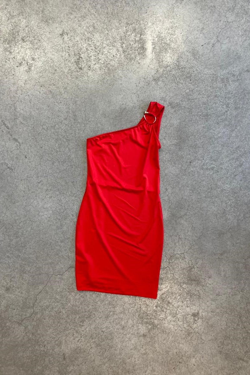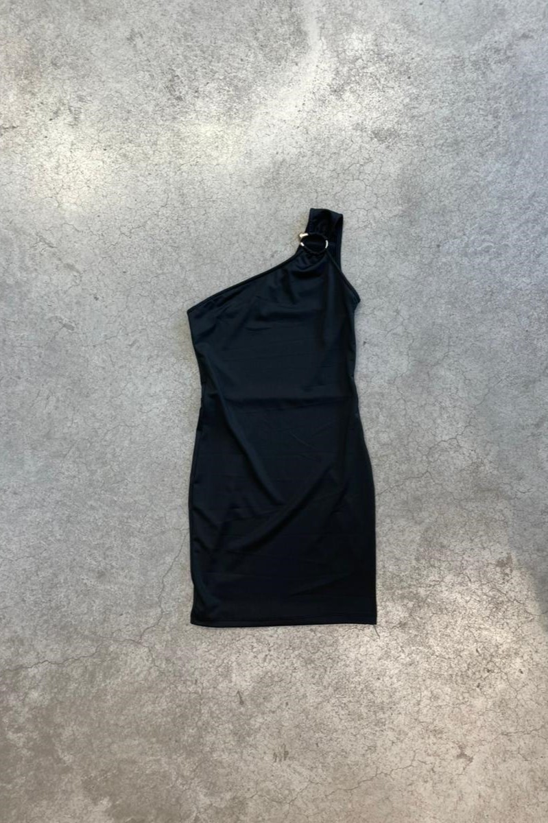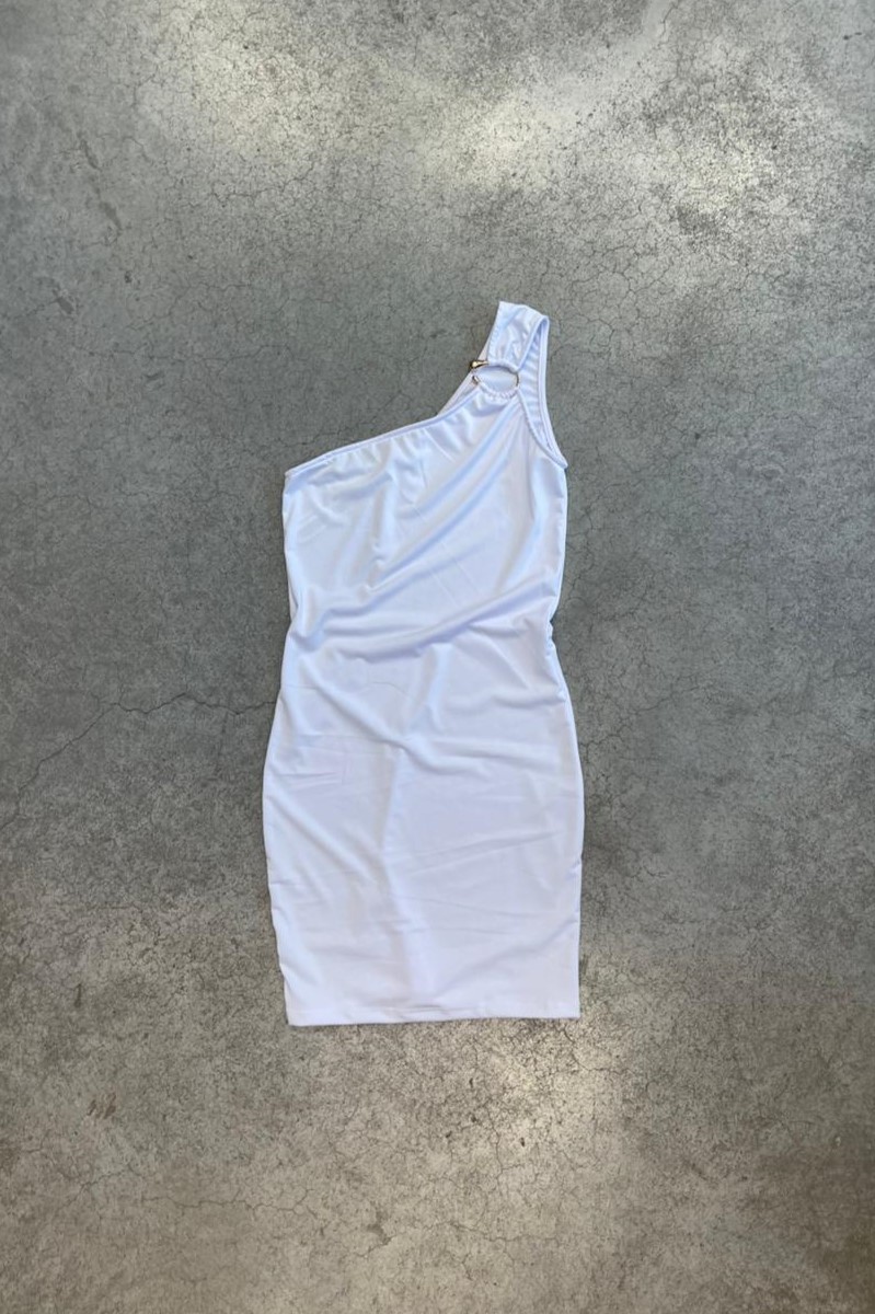 Vestido de lycra asimetrico con aplique de gota en hombro