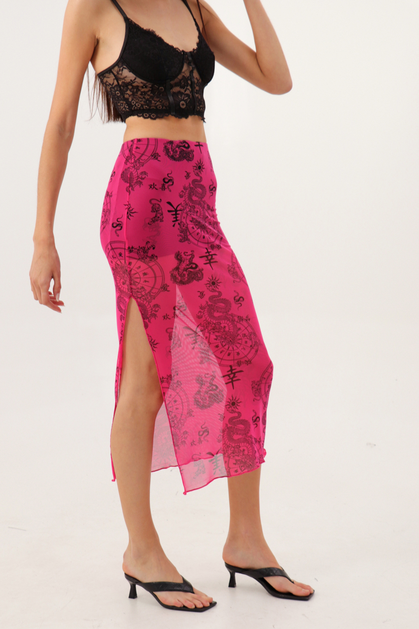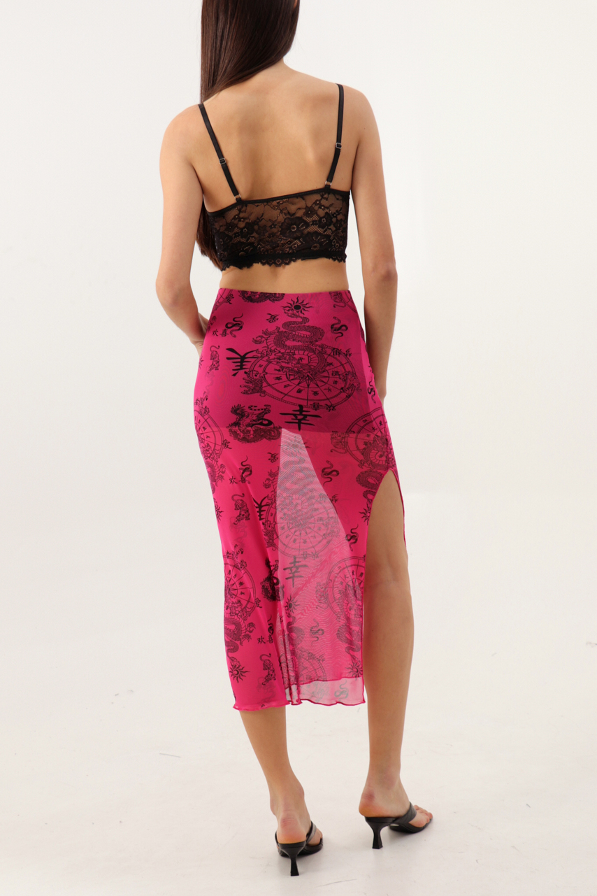 Pollera de tul con forro y tajo estampado de signos zodiacales chinos